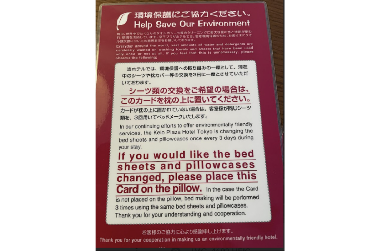 During my stay at a hotel in Japan I noticed these cards, which you must place on your pillow if you want your sheets changed. Otherwise the sheets will be changed every 3 days (which is still too much IMO - does anyone wash their sheets every three days at home?)