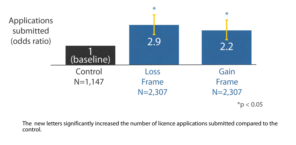 We randomly assigned “gain”- and “loss”-framed letters to rural business owners who use groundwater in B.C. Another smaller sample of business owners received no letter. The new BI letters more than doubled the rate at which people opened and submitted licence applications. We found no evidence of a significant difference between the gain- and loss-framed letters. This simple, inexpensive paper letter encouraged rural business owners to complete an online licence application.