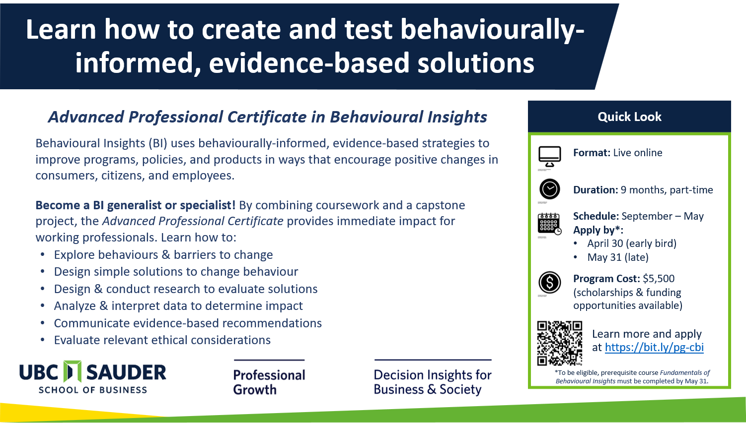 Apply for UBC’s online Advanced Professional Certificate in Behavioural Insights. Applications due by May 31 for the 2026-2027 cohort.