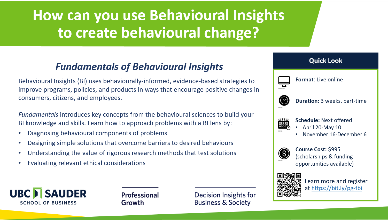 Register for UBC’s online Fundamentals of Behavioural Insights course. Next offered April 20-May 10, 2026.