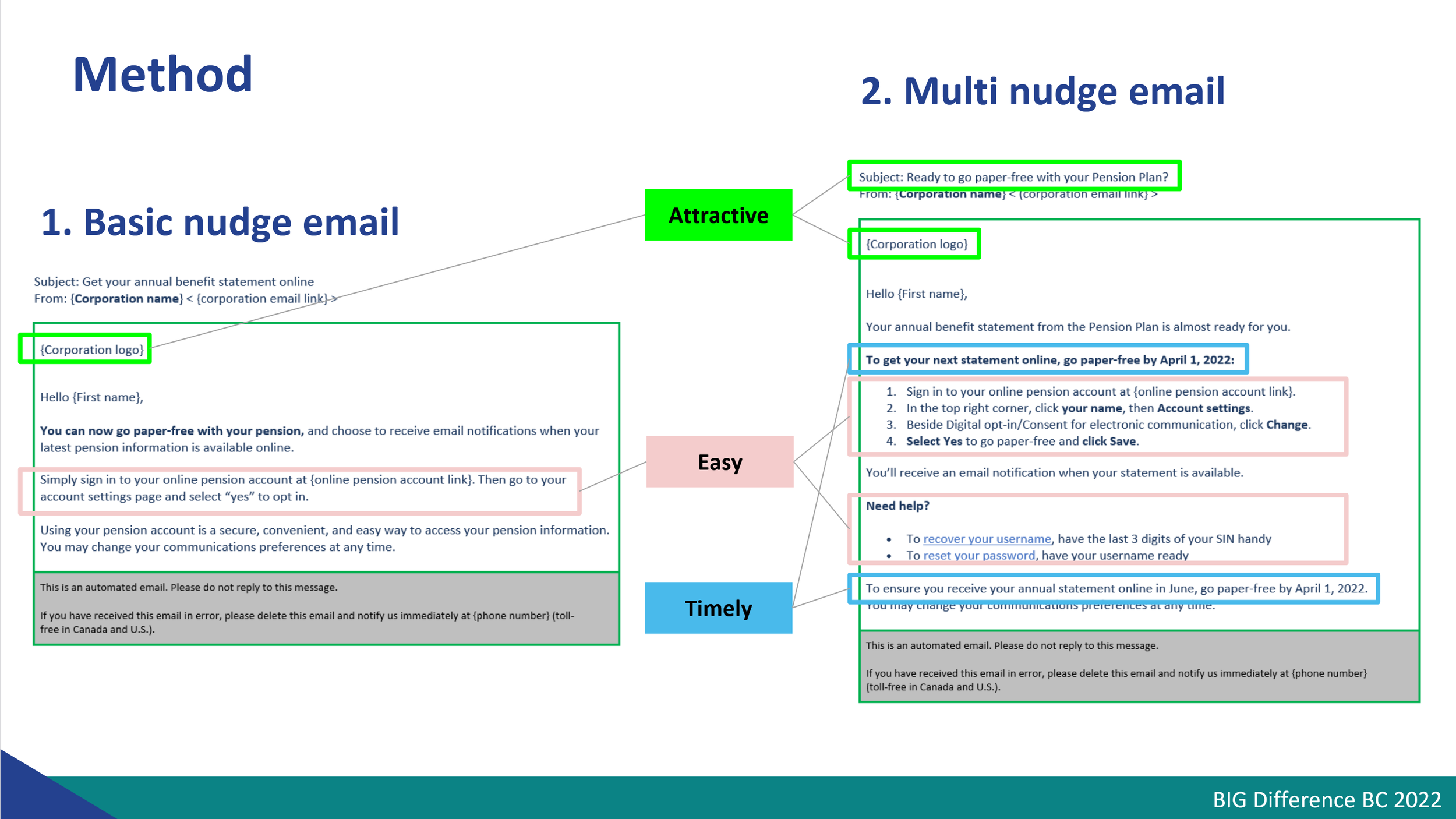 We trialled an email nudge to encourage working members of a Canadian public sector pension plan to choose digital delivery for their pension information. Email nudges significantly increased the number of plan members who logged into their online pension account and switched to digital delivery.
