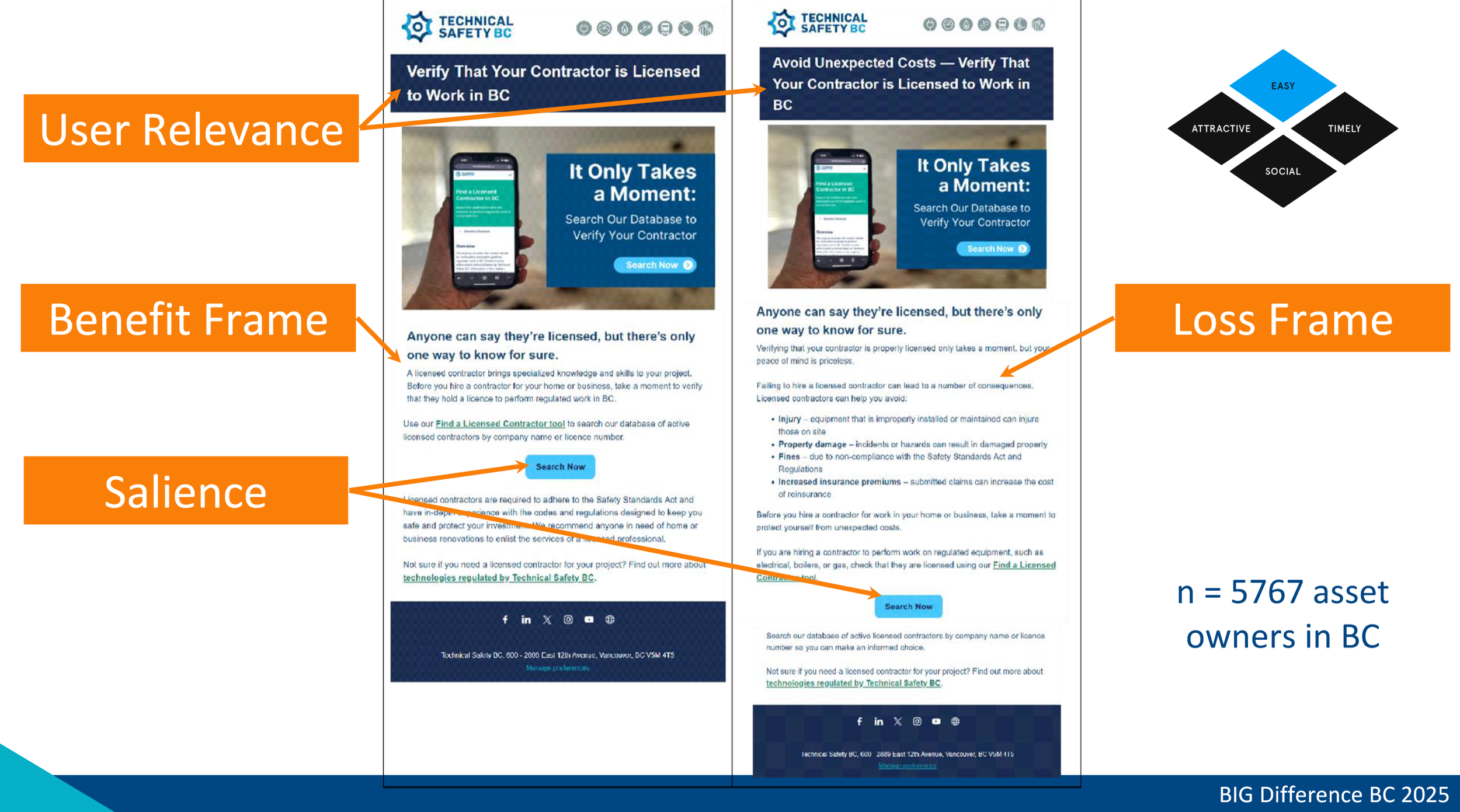 Encouraging safer hiring decisions means getting people to use public safety tools. We partnered with Technical Safety BC to test whether email framing and web simplification could nudge more people to use the “Find a Licensed Contractor” tool, finding mixed results across click-through rates and completed searches.